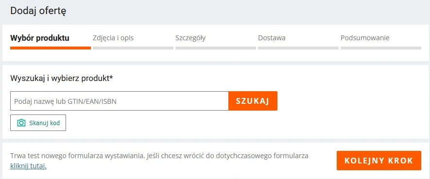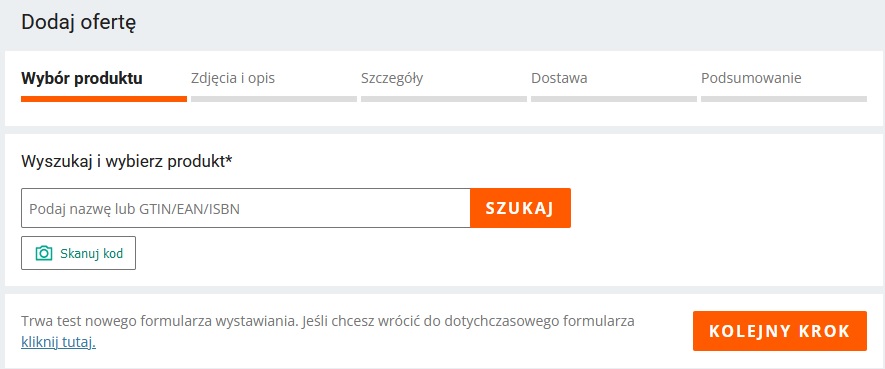 Teraz, wystawiając produkt „po nowemu”, zaczynamy od wybrania go z katalogu. Jak widać na poniższym zrzucie ekranu, nowość stanowi tu możliwość zeskanowania kodu.