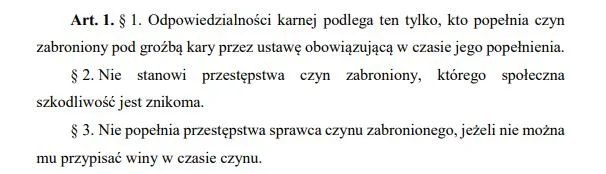 Odpowiedzialności karnej zgodnie z kodeksem karnym podlegają tylko zdefiniowane w art. 1 przestępstwa. Zgodnie z § 2 przestępstwem nie jest czyn, którego społeczna szkodliwość jest znikoma. W takim wypadku wyraz obywatelskiego nieposłuszeństwa utożsamiany jest z "wyrazem powszechnych odczuć społecznych, o których nie można mówić, że stanowią czyn niebezpieczny dla społeczeństwa (...). Tym samym czyny te charakteryzował stopień społecznego niebezpieczeństwa sprowadzony do granic znikomości, a jeżeli tak, to pomimo formalnego wypełnienia przez oskarżonych swoimi działaniami ustawowych znamion czynu stypizowanego (karalnego – przyp. autora) (…) , postępowanie karne wobec nich (oskarżonych – przyp. autora) musiało być umorzone“ (za Sądem Najwyższym, wyrok z dnia 7 czerwca 2006 r., sygn. akt III KK 394/05, publ. Biuletyn Prawa Karnego nr 7/06).