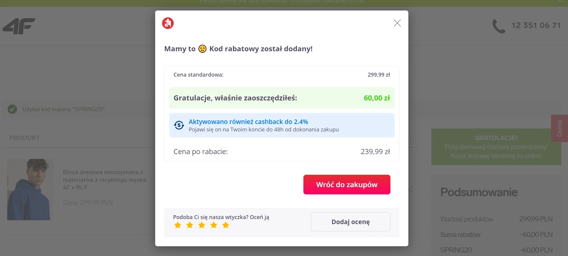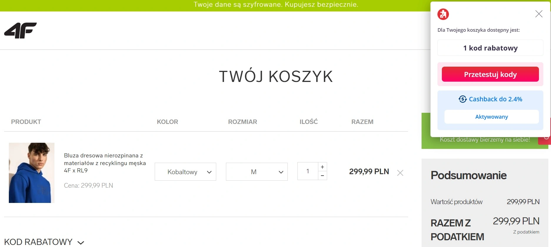 Po zainstalowaniu wtyczki (trwało to kilka sekund, z tym że warto pamiętać by zaznaczyć sobie alerabat.com jako przypięty, wystarczy kliknąć na przycisk puzzla, a potem pinezkę) wybrałem sobie dla przykładu pierwszy z brzegu sklep 4F. Akurat brakowało mi sportowej bluzy, więc upatrzyłem sobie M-kę za 299 złotych. Kiedy przeszedłem do koszyka, „zawołała” mnie z przeglądarki wtyczka. Pojawiło się kilka możliwości zaoszczędzenia – zarówno poprzez któryś z kodów rabatowych, jak i promocje. Ale nie musiałem sam się przez nie przedzierać, bo po kliknięciu w przycisk Przetestuj Kody wtyczka sama wybiera ten najkorzystniejszy i od razu aplikuje go do koszyka.