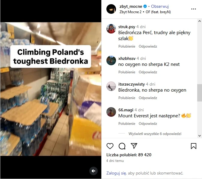 Ostatnio na instagramowym profilu zbyt_mocne pojawiło się nagranie pokazujące wspinanie się po stosach z towarami w Biedronce