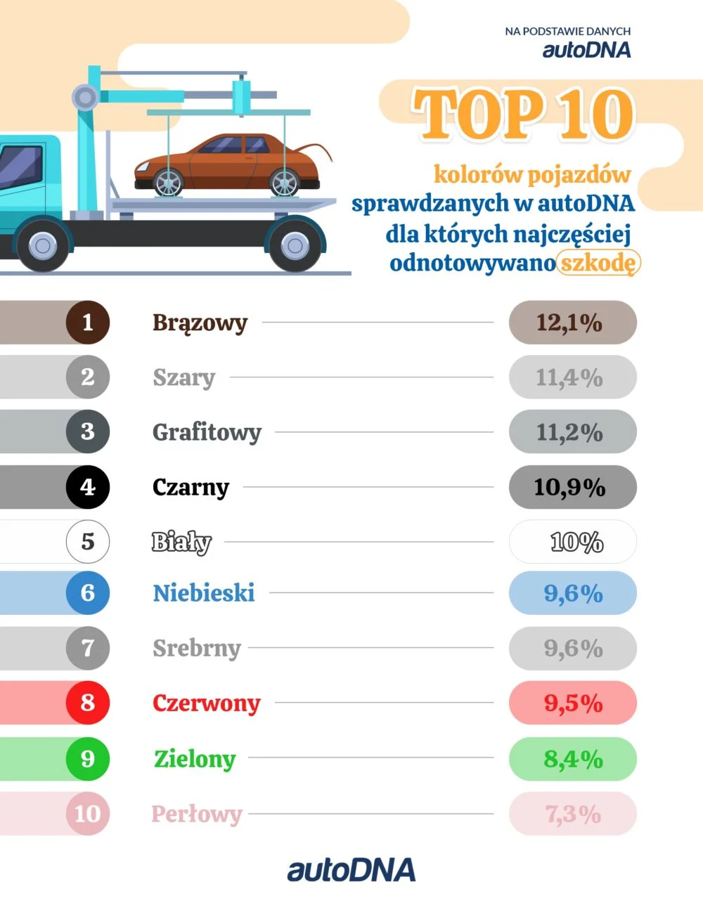Czy zastanawialiście się kiedyś, jak kolory aut przekładają się na statystyczne ryzyko szkody? Nad tym jakże ciekawym dylematem pochylili się autorzy bloga „autoDNA”. Wyróżniono dziesięć kolorów pojazdów, dla których najczęściej odnotowywano szkodę.