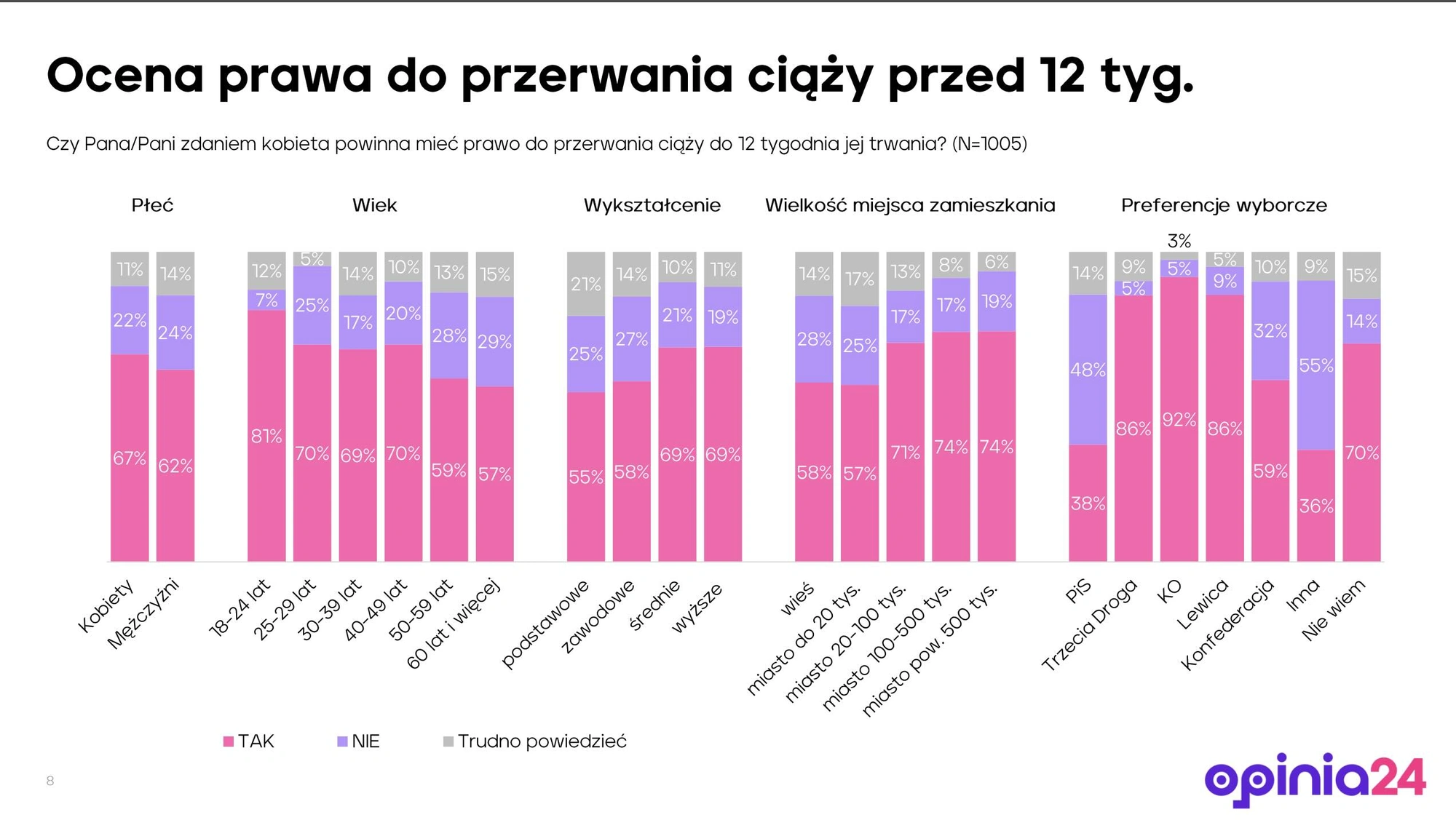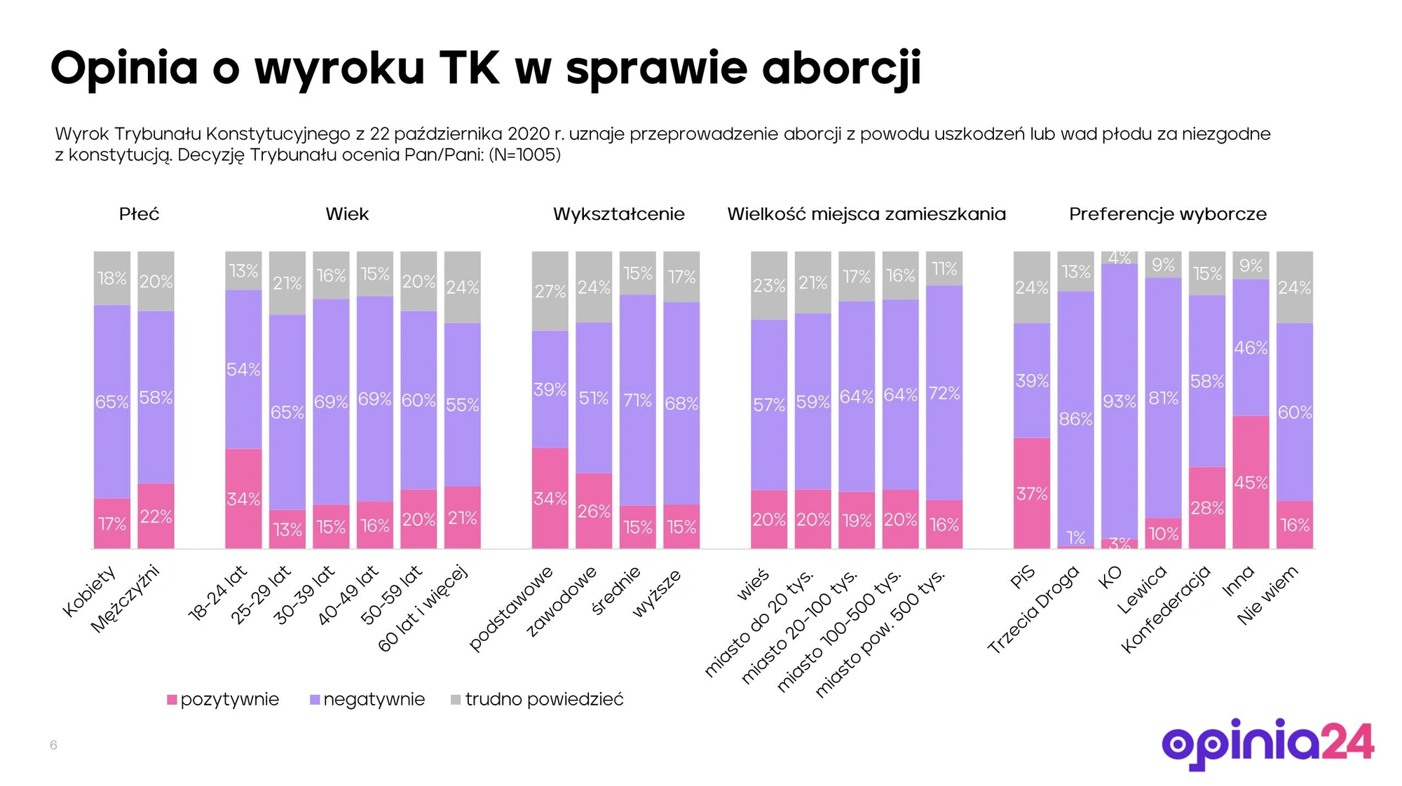 W badaniu zdecydowana większość respondentów (88%) wyraziła negatywną opinię na temat wyroku Trybunału Konstytucyjnego z 22 października 2020 r., który uznał przerywanie ciąży ze względu na wady płodu za niekonstytucyjne. Znaczna większość (65%) uważa także, że kobieta powinna mieć prawo do aborcji do 12 tygodnia ciąży. Wśród najmłodszych respondentów (18-24 lata) wsparcie dla tej opcji wyniosło nawet 81%.