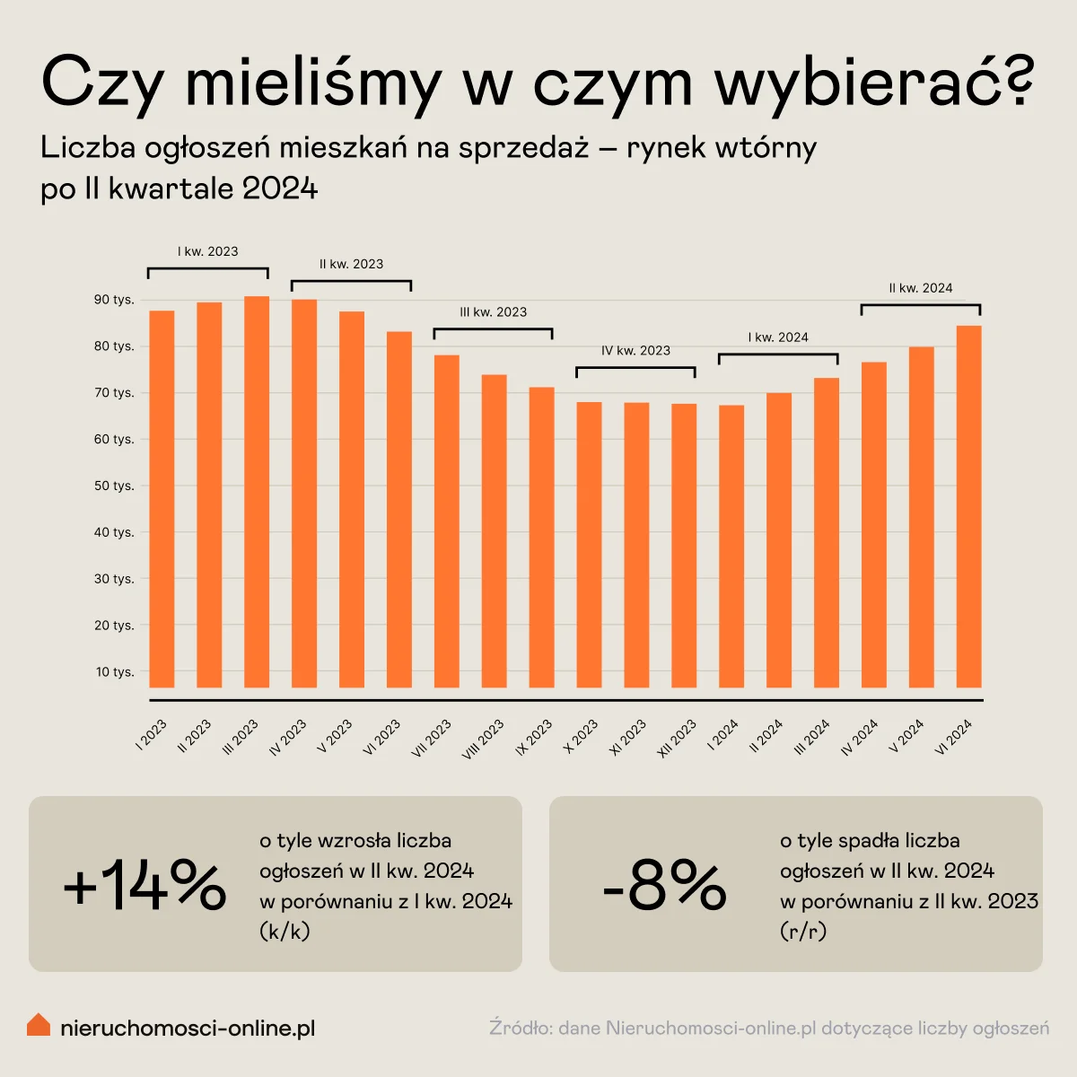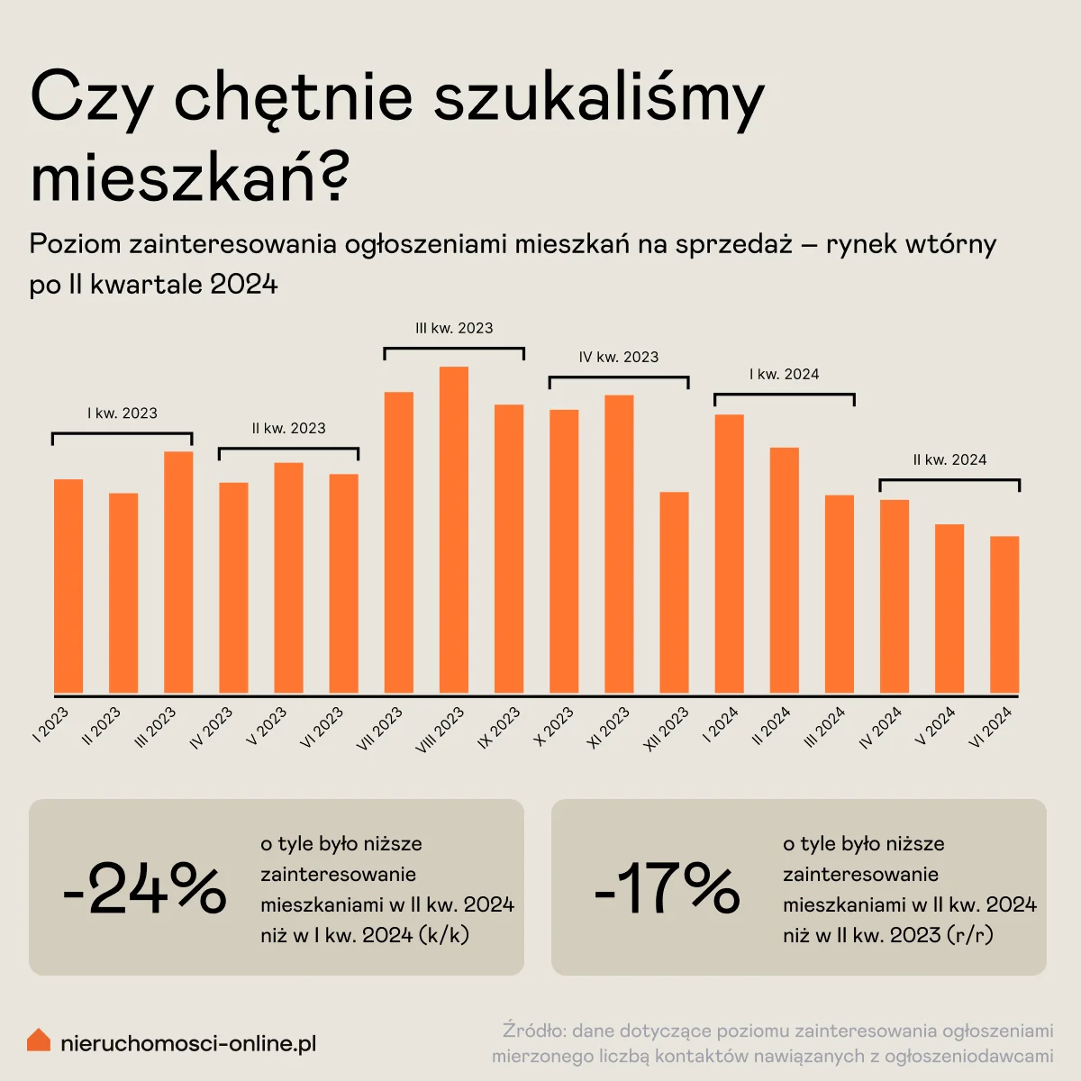 Z najnowszego raportu Nieruchomosci-online.pl wynika, że zainteresowanie mieszkaniami na rynku wtórnym znacznie zmalało w II kwartale 2024 roku. W porównaniu do I kwartału, liczba wyszukiwań i kontaktów z ogłoszeniodawcami spadła o około 25%. Najbardziej odczuli to agenci nieruchomości, zwłaszcza ci zajmujący się większymi mieszkaniami. Dla porównania, ruch w biurach pośredników oferujących kawalerki zmalał o 32%.