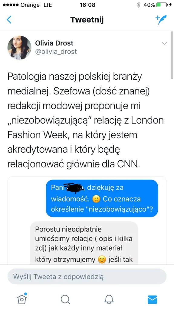Praca za darmo - na to długo musieli się przygotowywać ludzie zaczynający kariery w mediach, grafice czy reklamie. Stażyści, praktykanci, budowniczy portfolio - różnie nazywano takich pracowników. Pojawił się jednak nowy eufemizm - praca "porostu niezobowiązująca". Taką trudną do odrzucenia propozycję dostała Olivia Drost, polska dziennikarka mieszkająca i studiująca w Londynie. Przygotowuje (odpłatnie) relacje dla CNN z wielkiej imprezy, ale dostała jeszcze jedną ofertę - "niezobowiązującą", oczywiście z polskiej reakcji.