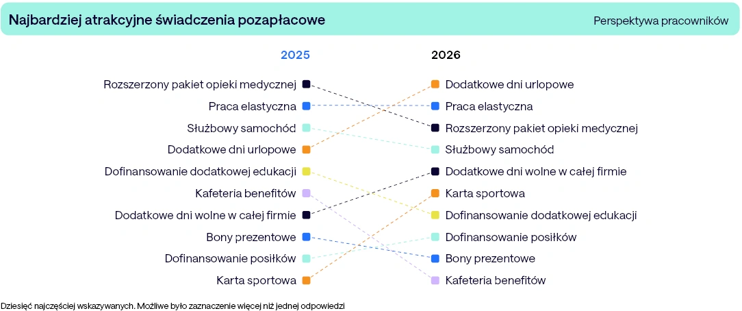 Jedną z najbardziej wyrazistych zmian w najnowszym raporcie jest przetasowanie w rankingu najbardziej pożądanych benefitów pozapłacowych. W 2025 roku na szczycie był rozszerzony pakiet opieki medycznej, za nim praca elastyczna i samochód służbowy. W 2026 roku hierarchia wygląda inaczej: na pierwszym miejscu znalazły się dodatkowe dni urlopowe (skok o trzy pozycje), na drugim praca elastyczna, a pakiet medyczny spadł na trzecią lokatę.