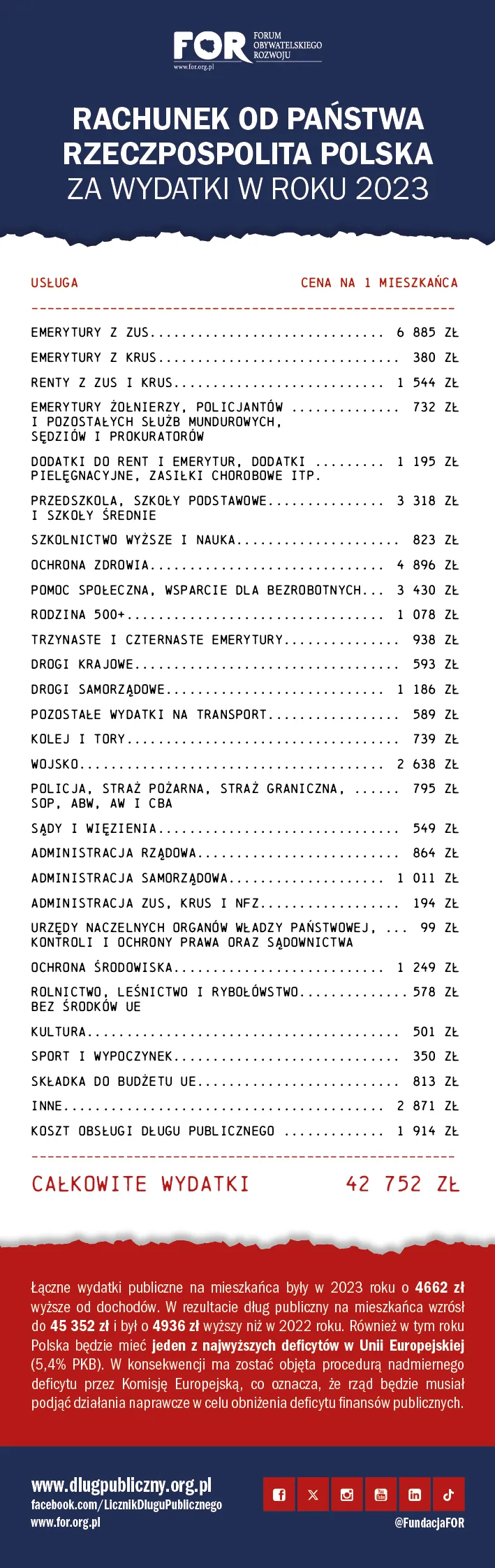 W 2023 roku wydatki publiczne w Polsce przekroczyły 1,59 biliona złotych, co stanowiło 46,7% PKB kraju. Przełożone na jednego mieszkańca, wydatki wyniosły ponad 42 tysiące złotych, natomiast w przeliczeniu na jednego pracującego suma ta sięgnęła prawie 100 tysięcy złotych.