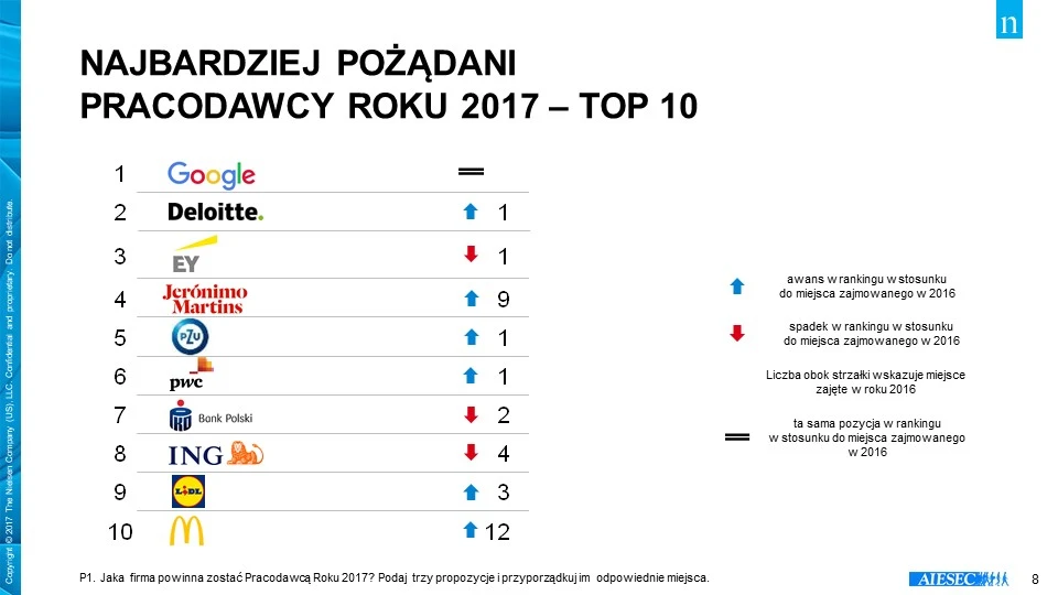 Firma AIESEC przeprowadziła badanie "Pracodawca roku 2017", z których wynika, że w czołówce najbardziej pożądanych pracodawców znajdują się brandy Google i Biedronka. W badaniach brali udział studenci ostatniego roku studiów licencjackich oraz IV i V roku studiów magisterskich.