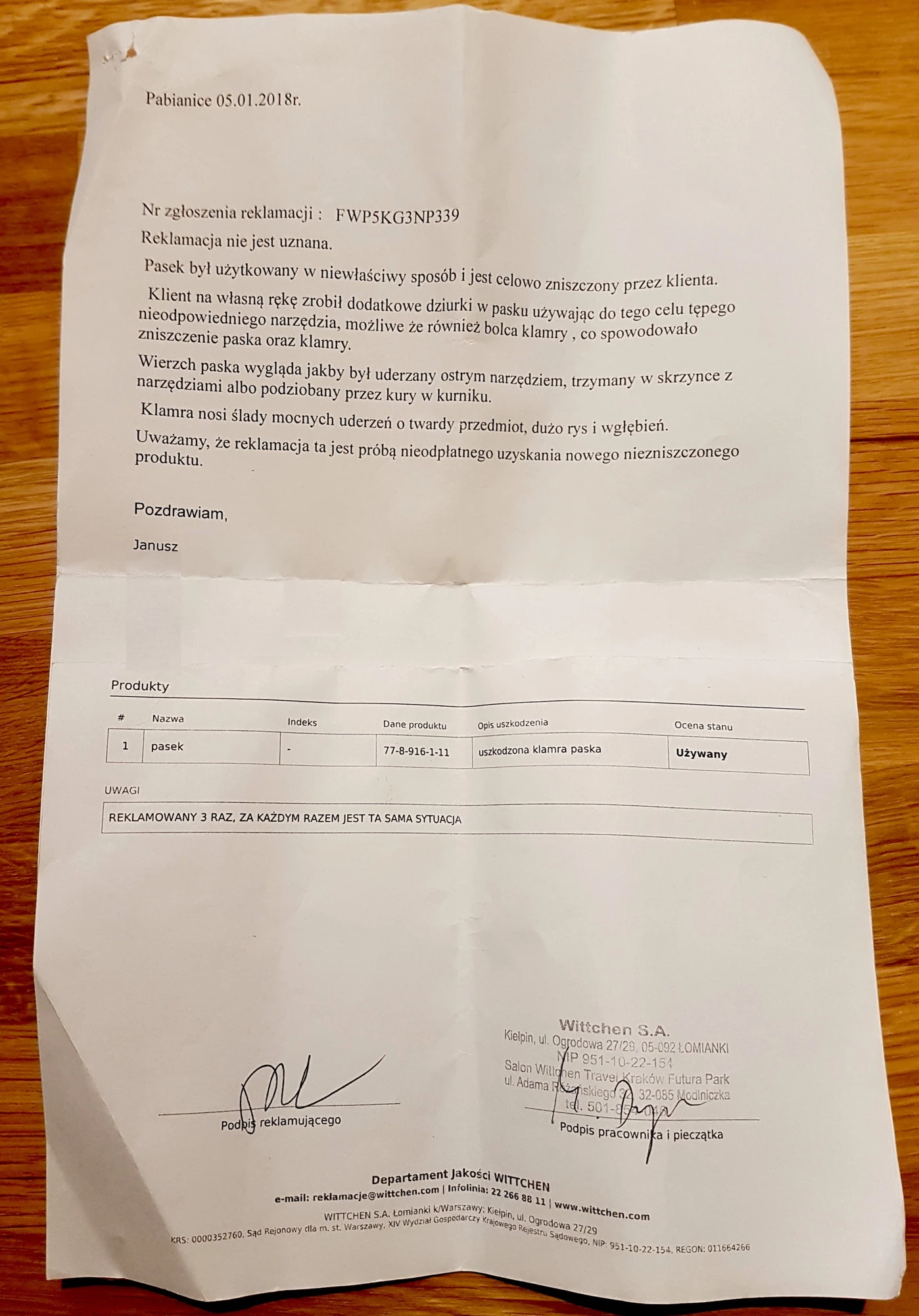 Nie ma to jak wspieranie życzliwych, polskich przedsiębiorców. Pewien użytkownik Wykopu kupił pasek od firmy Wittchen, ale chciał zareklamować rozpadającą się co jakiś czas klamrę od paska. Odpowiedź, jaka od nich przyszła, zwala z nóg.