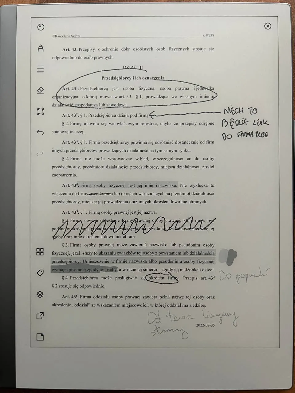 W rzeczywistości reMarkable 2 jest raczej odrębną kategorią produktów, adresowaną do osób pracujących dużo na dokumentach i przede wszystkim lubujących się w robieniu odręcznych notatek, uwag, rysunków. Przy użyciu tego urządzenia można na przykład wygodnie pracować na drafcie umowy w PDF, zakreślać irytujące nas fragmenty czy odręcznie dopisywać swoje uwagi na marginesie, a potem całość wysłać kontrahentowi. Z drugiej strony - odręczne bazgroły raczej nie są wygodną i przyjętą praktyką w branży. Jakbym odesłał drugiemu prawnikowi umowę, na której namalowałem dymki z uwagami, to prawdopodobnie stałbym się w jego kancelarii ofiarą anegdot, a już na pewno sporej irytacji.