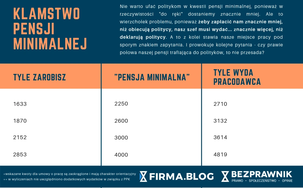 Dzieje się tak, ponieważ przedsiębiorca poza wskazywanym często wynagrodzeniem brutto, musi też partycypować w pokryciu naszych składek ZUS, opłacić składkę na Fundusz Pracy i Fundusz Gwarantowanych Świadczeń Pracowniczych. Ponieważ na firma.blog i Bezprawniku troszczymy się głównie o perspektywę małych i średnich przedsiębiorców, obliczeniach nie wskazuję jeszcze dodatkowych obciążeń pracodawców, które wkrótce przyniosą Pracownicze Plany Kapitałowe.