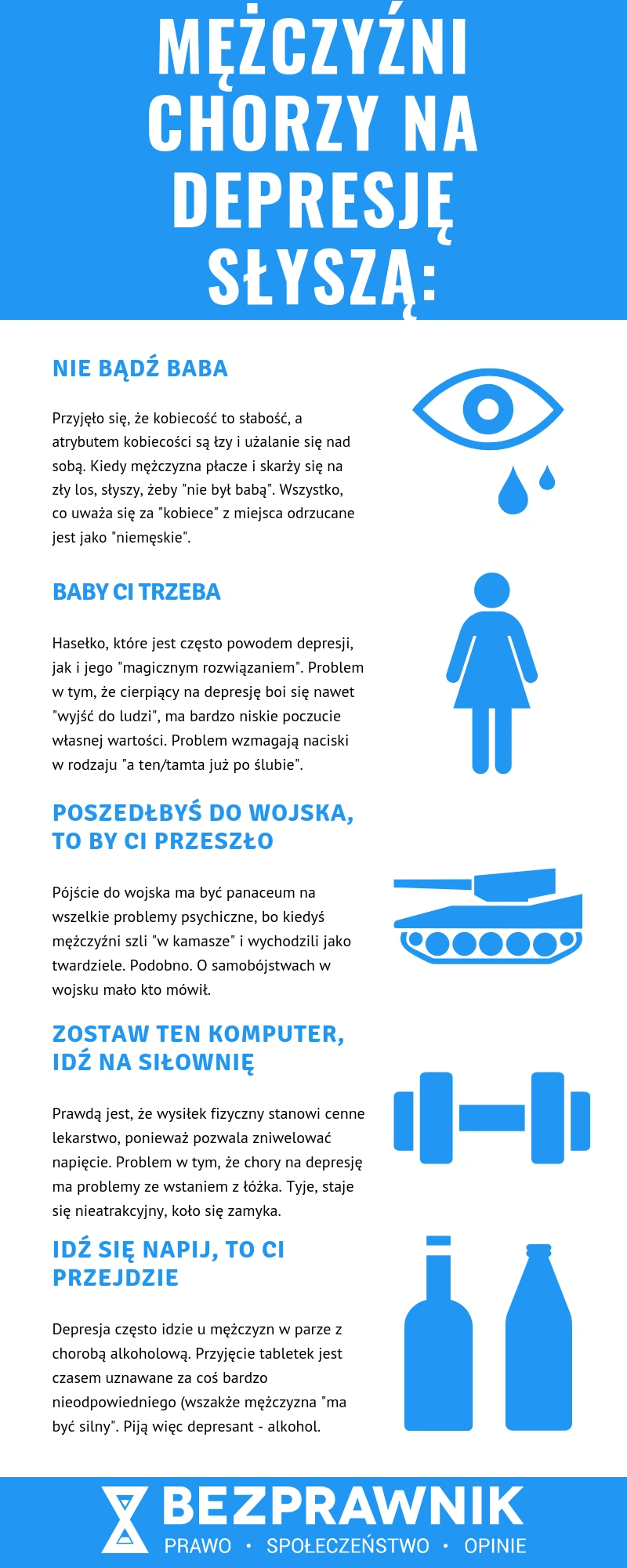 Przeglądam nie tak dawno Demotywatory (każdy robi coś dla zabicia czasu), a tu kolejny obrazek o tym, że mężczyźni to już nie mężczyźni, tylko "pe" w rurkach. Że kiedyś szło się do wojska, kiedyś to mężczyźni brali życie garściami, jedną ręką utrzymywali rodzinę, a drugą napędzali gospodarkę. Mężczyznom odbiera się prawo do słabości i płaczu. Mężczyznom nie pozwala się chorować na depresję czy nerwicę, mają przecież tyle do zrobienia. Muszą wyglądać tak, jak oczekuje od nich tego społeczeństwo. Nie może się na nich pojawić nawet ślad tego, co uważa się za zniewieścienie.