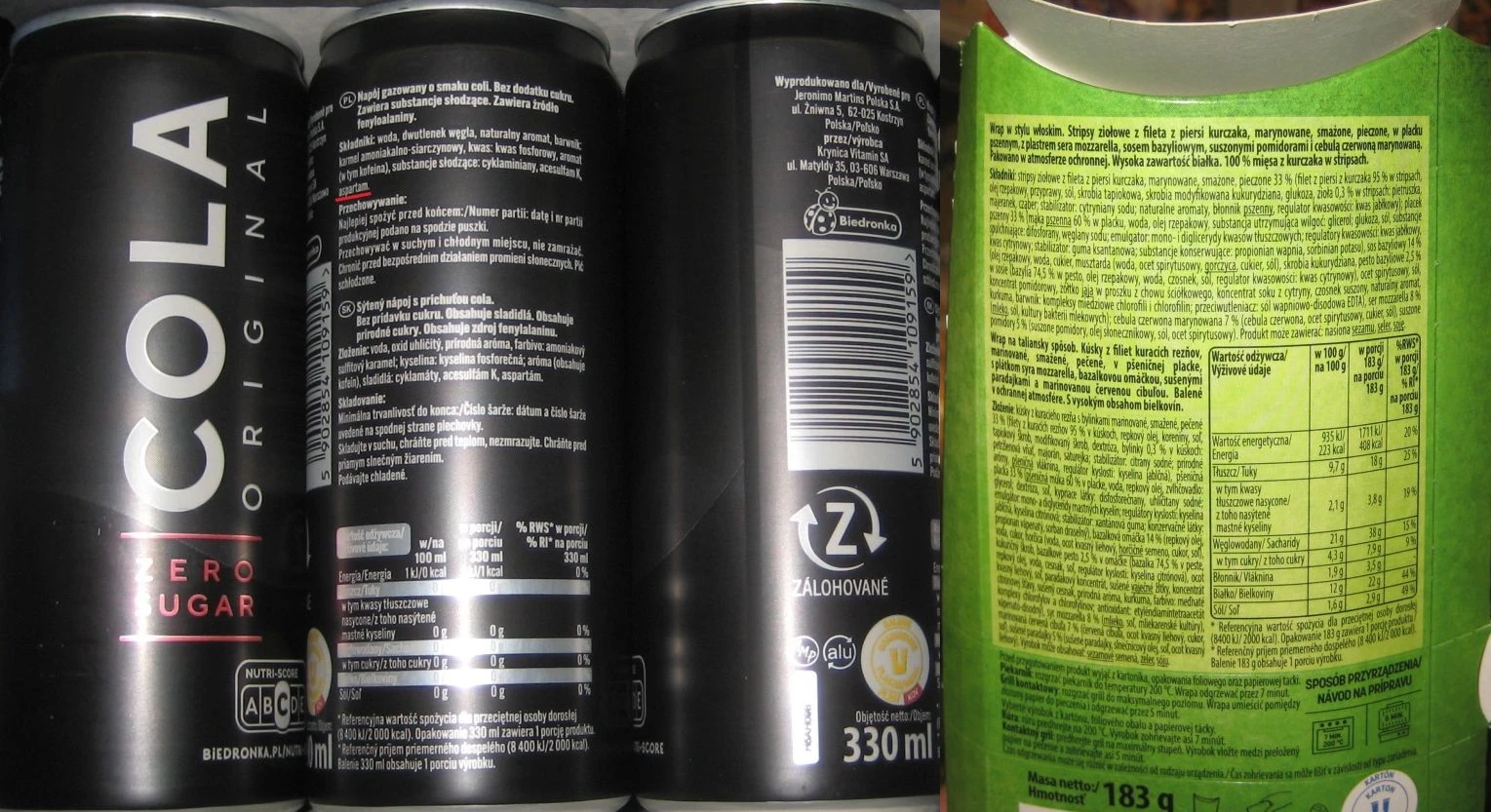 Cola Original Zero z potencjalnie rakotwórczym aspartamem niestety stanowi tu zaprzeczenie ich potrzeb. Z innymi artykułami niekoniecznie jest lepiej. Dla przykładu pozycja Wrap&strips zawiera długą i skomplikowaną listę składników.