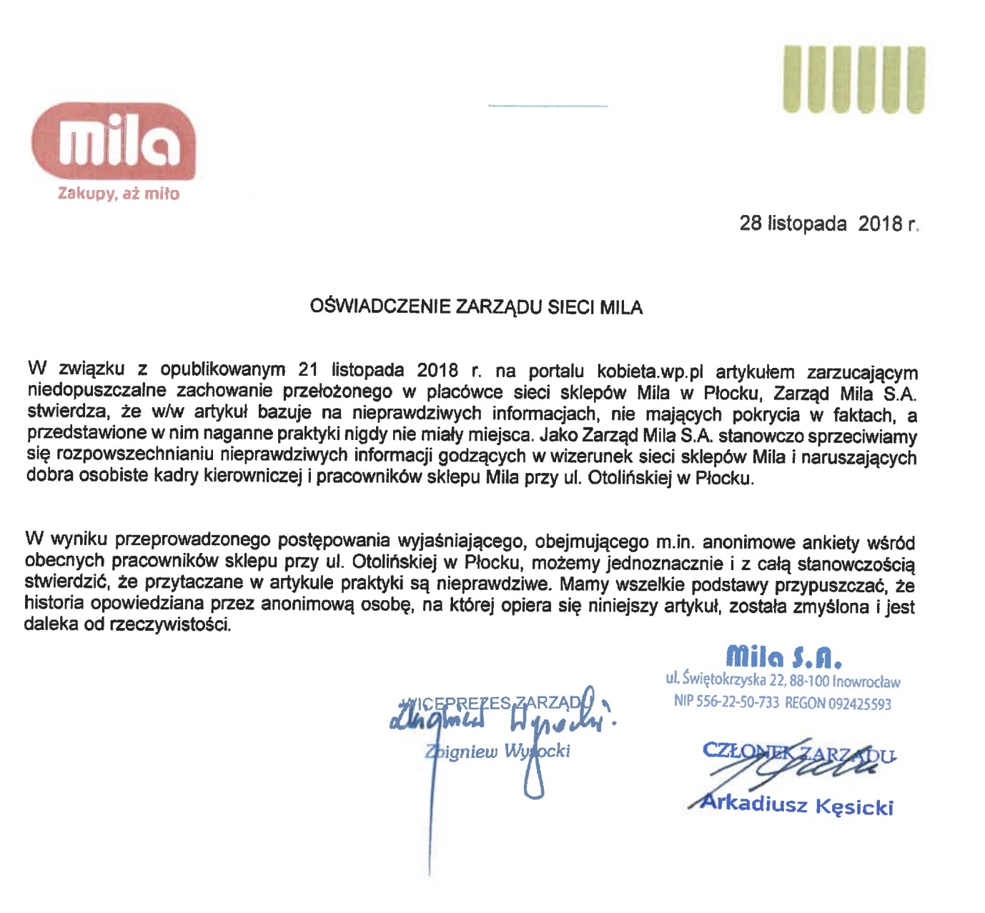 Supermarket Mila w Płocku na Otolińskiej 11 najwyraźniej nie wie, czym są prawa pracownika. Przenosimy się w czasie o kilka lat i znowu słyszymy opowieści o tym, że pracownicy muszą nosić pieluchy. Co to za standardy?