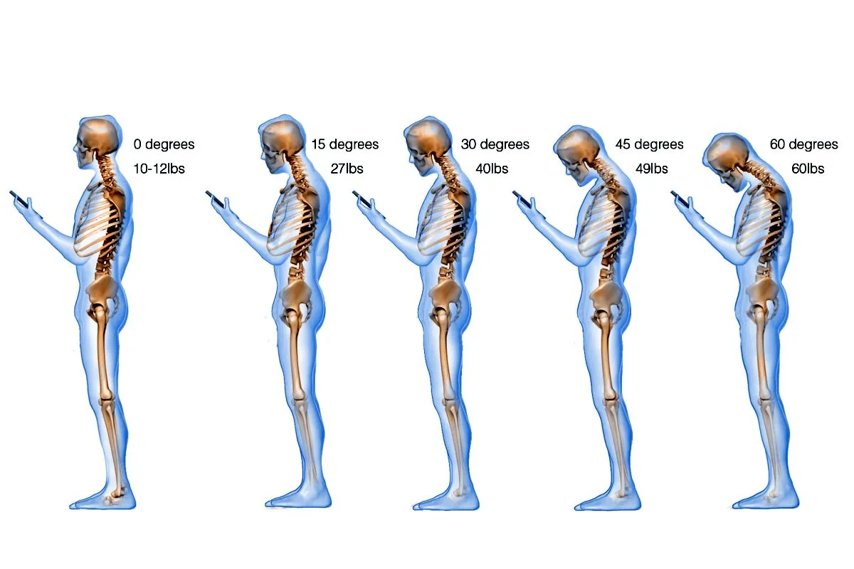 Okazuje się, że już niewielkie pochylenie głowy do przodu powoduje spore obciążenie dla kręgosłupa i mięśni odpowiedzialnych za poruszanie i prostowanie tych rejonów naszego ciała. Jak pokazuje infografika przygotowana przez Dr. Kennetha Hansraja, który jest lekarzem chirurgiem i ortopedą pracującym w klinikce Chirurgii i Rehabilitacji Kręgosłupa w Nowym Jorku, głowa ważąca około 5,5 kg nie sprawia kręgosłupowi i mięśniom zbyt wielu problemów. Pochylenie jej o około 15 stopni powoduje, że kark musi radzić sobie z obciążeniem około 12 kg. 30 stopni od pionu, to już 18 kg, a 45 stopni zwiększa obciążenie karku do wartości 22 kg, a 60 stopni to aż 27 kg.