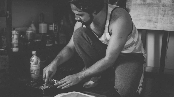 Pracownicy klęczący w pracy, strudzeni przy niskim stole. Niedaleko nich stoją krzesła, ale nie wolno im ich zabrać, bo to dla mistrza i kontrolerów. Takie rzeczy dzieją się w PZL Świdnik, ale związki zawodowe...