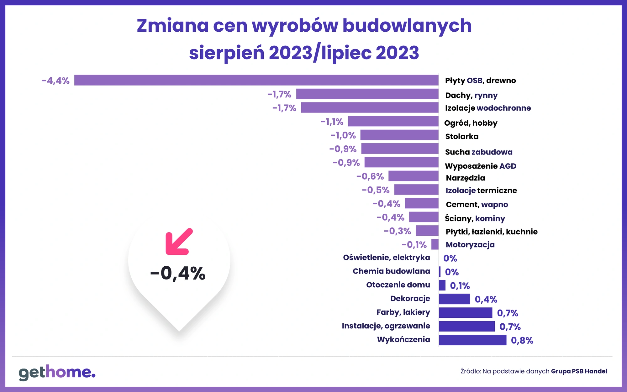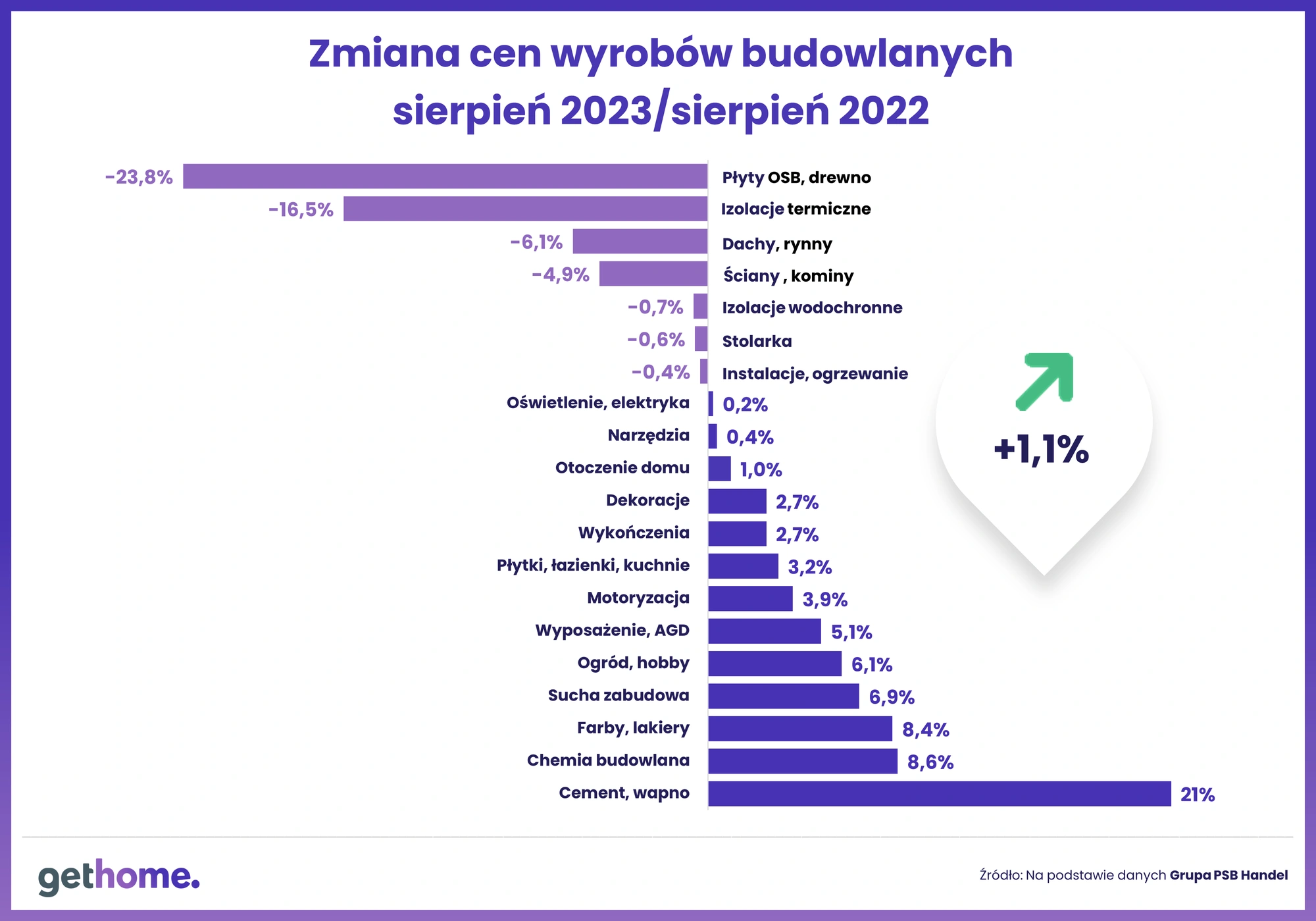Dane Grupy PSB Handel z sierpnia wskazują, że średnia cena 20 grup asortymentowych była minimalnie niższa niż w poprzednim miesiącu, z 13 grupami notującymi spadek cen. Dla przyszłych właścicieli domów to zachęcające dane, zwłaszcza że, jak podkreśla Wielgo, zmniejsza to ryzyko zaciągania większych kredytów niż planowane oraz prośby do banków o dodatkowe fundusze w trakcie realizacji inwestycji.