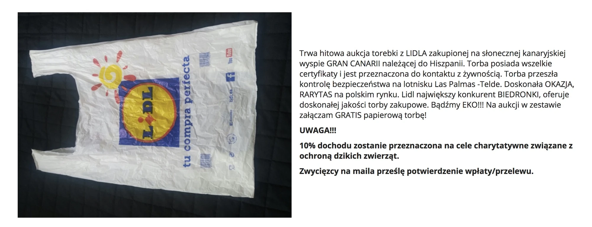 Atrakcyjna oferta na Allegro - tylko tam wylicytować można jedyną w swoim rodzaju torbę z Lidla pochodzenia kanaryjskiego. Co wyróżnia ją ze wszystkich śmiesznych aukcji? Szlachetne intencje Wystawiającego.