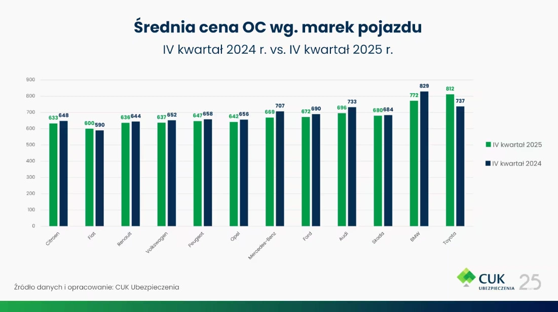 W powszechnej świadomości - a może podświadomości - Polaków zakorzeniło się przekonanie, że najwięcej wypadków popełniają kierowcy osobowych BMW. Mają to być kierowcy jeżdżący szybko, niebezpiecznie, łamiący wszelkie przepisy kodeksu drogowego. Dlatego też średnie ceny polis OC są w przypadku marki BMW najwyższe w Polsce. A przynajmniej były, bo od IV kwartału 2025 r. BMW zostało zdetronizowane przez zupełnie niepozorną markę.
