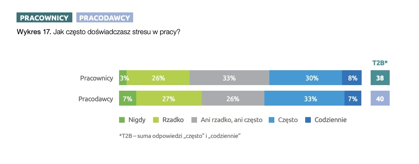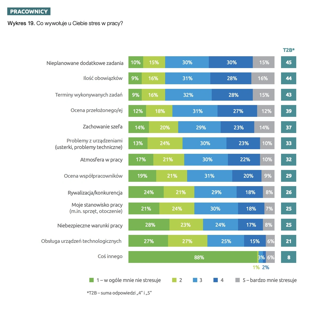 Ponad jedna trzecia pracowników oraz pracodawców w Polsce regularnie doświadcza stresu podczas wykonywania obowiązków zawodowych, co potwierdzają dane z raportu „Dobrostan pracownika, czyli wellbeing w pracy” przygotowanego przez Koalicję Bezpieczni w Pracy. Przyczyną tego stanu rzeczy są często narzucane terminy, ilość obowiązków oraz nieoczekiwane zadania. Paradoksalnie, zarówno pracodawcy, jak i pracownicy zgadzają się, że stres negatywnie wpływa na efektywność pracy oraz relacje w zespole.