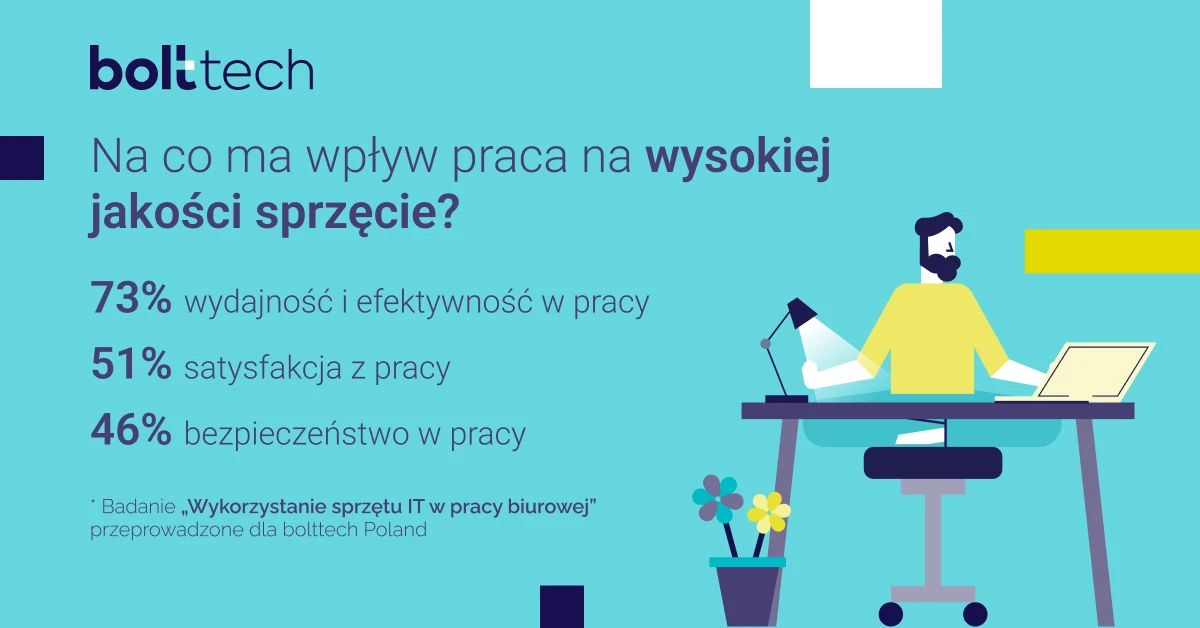 Wyniki badań przeprowadzonych na zlecenie bolttech Poland wskazują, że jakość sprzętu IT bezpośrednio wpływa na wydajność i efektywność pracy. Aż 73% respondentów zgadza się, że lepsze urządzenia zwiększają efektywność. Przytoczone dane podkreślają, że niezawodność, wydajność oraz długi czas pracy na baterii to kluczowe cechy sprzętu, które pracownicy doceniają najbardziej.