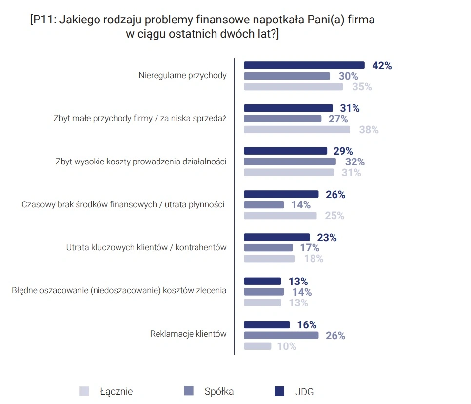 Średnie przedsiębiorstwa borykają się także z trudnościami wynikającymi z niewłaściwych szacunków. Największą bolączką przedsiębiorców są jednak zatory płatnicze. Skutkują one najczęściej utratą płynności finansowej i – jak w przypadku mikroprzedsiębiorstw – sięganiem po prywatne oszczędności. Najwyższy odsetek przedsiębiorców deklaruje, że główne problemy finansowe przedsiębiorstw są efektem nieregularnych bądź zbyt niskich przychodów. Skarżą się oni również na zbyt wysokie koszty prowadzenia działalności.