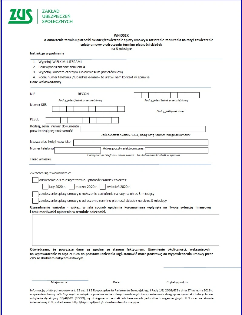 - Już jest - uproszczony, jednostronicowy wniosek o odroczenie płatności składek ZUS ze względu na epidemię koronawirusa