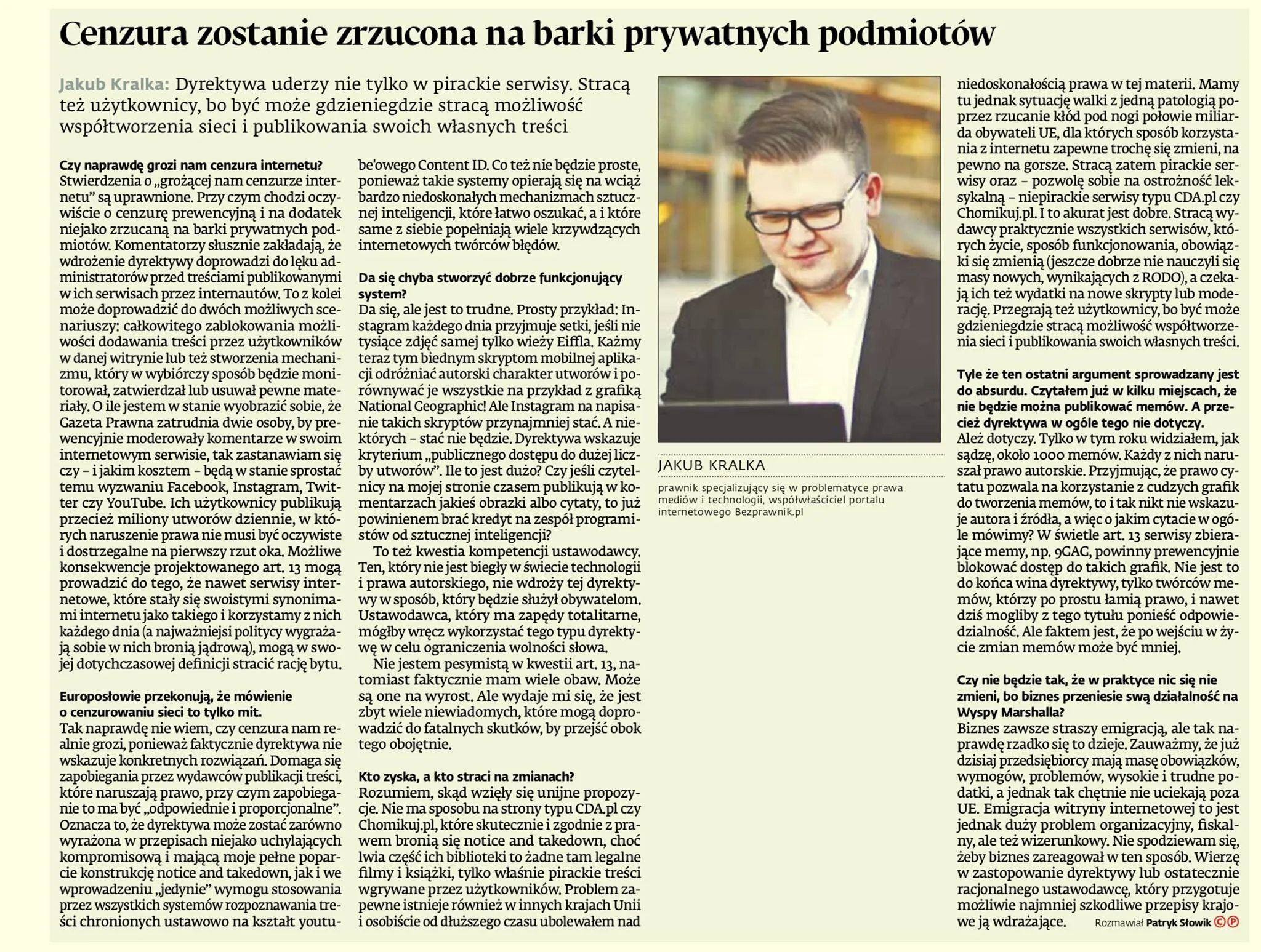 Kolejny raz miałem okazję rozmawiać z redaktorem Patrykiem Słowikiem z Dziennika Gazety Prawnej. W marcu dyskusja dotyczyła prawa reklamy w internecie, nieuczciwych blogerów i gwiazd YouTube'a. Tym razem rozmawialiśmy o kontrowersjach związanych z planowanym wejściem w życie dyrektywy unijnej zawierającej niesławny Artykuł 13. Zapraszam do lektury.