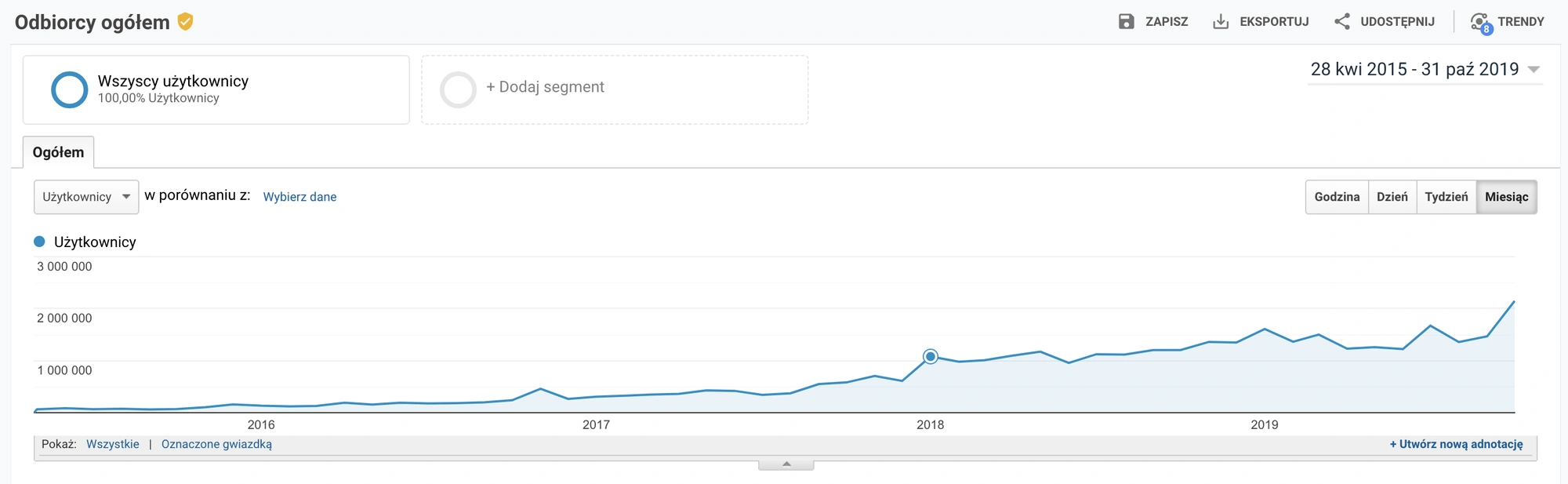 Bezprawnik wystartował pod koniec kwietnia 2015 roku. Pierwszy milion udało nam się przekroczyć w styczniu 2018 roku, ustabilizowaliśmy formę, a teraz świętujemy już ponad dwa miliony. Niebagatelną rolę w tym sukcesie odegrał start podserwisu firma.blog i większe nastawienie na treści firmowe. Stanowiły aż 40% spośród dziesięciu najchętniej czytanych tekstów w minionym miesiącu. Nasza oglądalność, oczywiście przy innej metodologii badania realnych użytkowników, znajduje też potwierdzenie w badaniach Gemius.