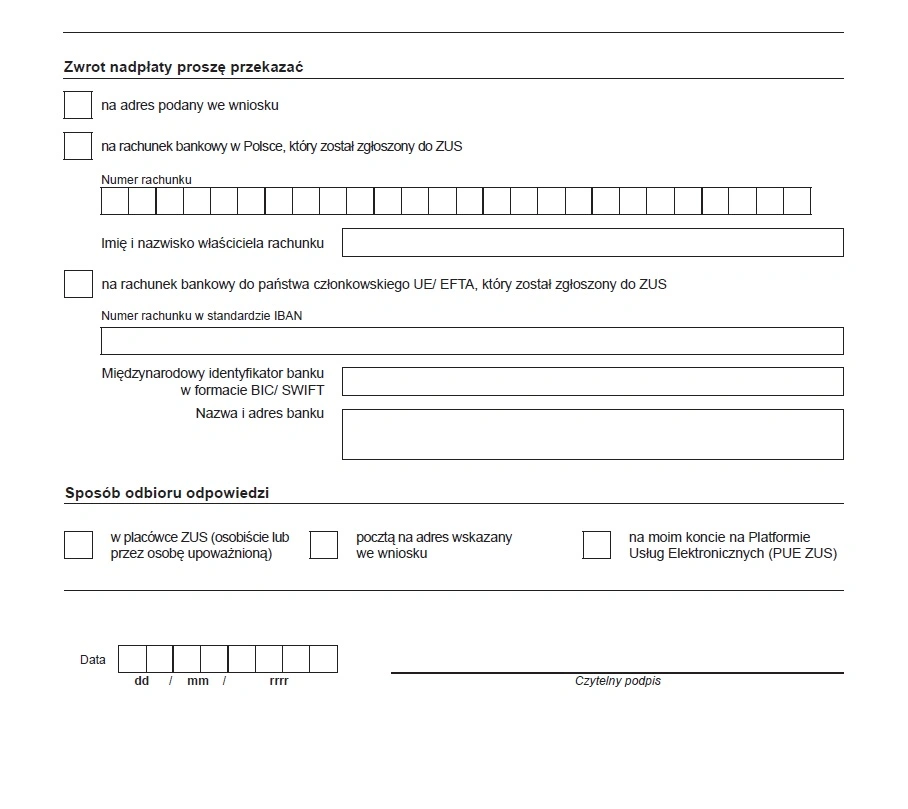 Następnie w formularzu należy podać numer konta bankowego, na który ma zostać zwrócona nadpłata. Numer rachunku bankowego musi być zapisany na koncie płatnika składek ZUS. Jeżeli zmieniliśmy numer rachunku, przed złożeniem wniosku należy go zaktualizować w panelu ZUS.