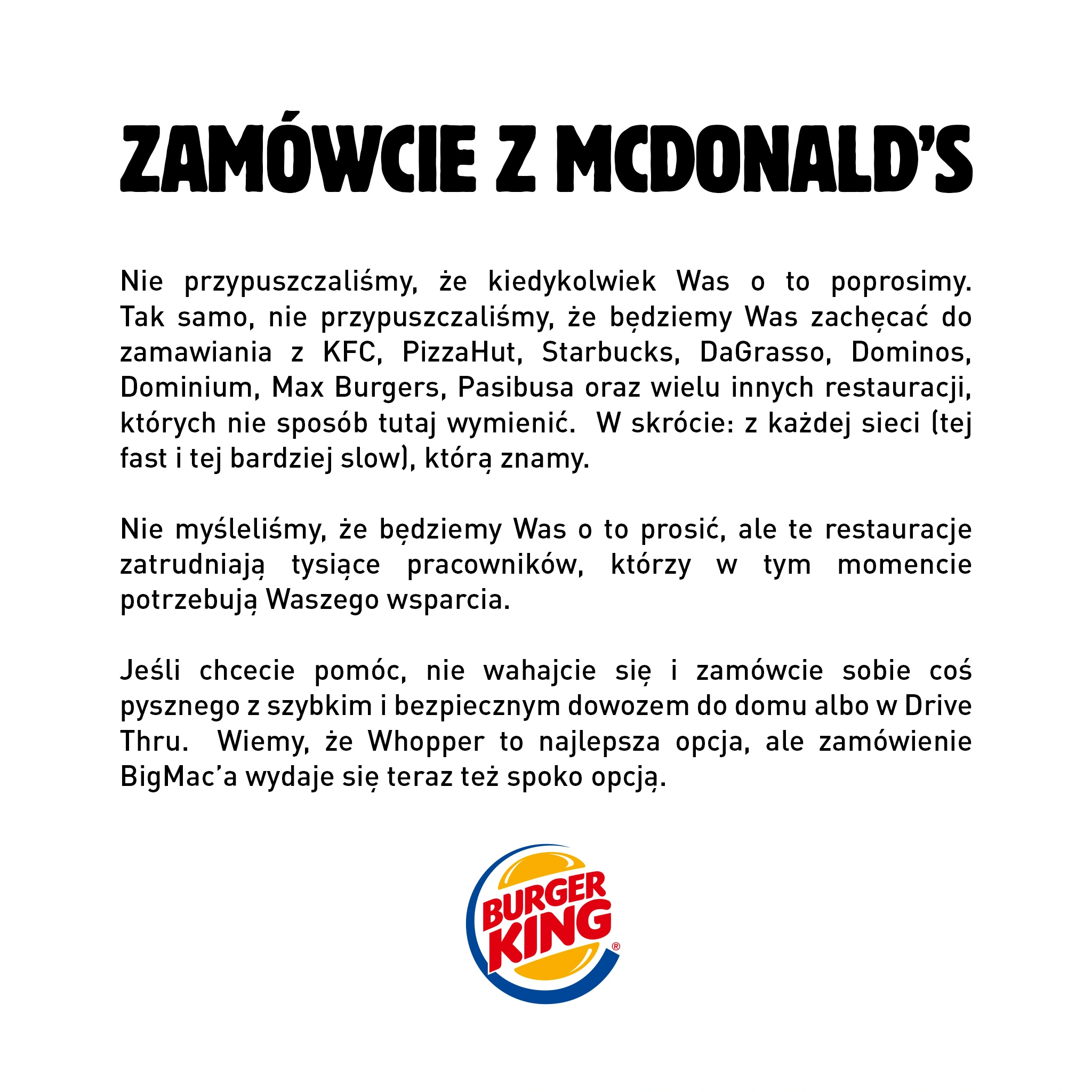 „Zamówcie z Mcdonalds”. Grafika opatrzona takim hasłem znalazła się na profilach Burger Kinga w mediach społecznościowych nie tylko w Polsce, ale i w wielu innych krajach. To unikalny gest solidarności, ale oczywiście również świetne zagranie marketingowe. Pokazuje w jak trudnej sytuacji znalazła się branża gastronomiczna. Pamiętajmy jednak, że największej pomocy potrzebują małe lokale.