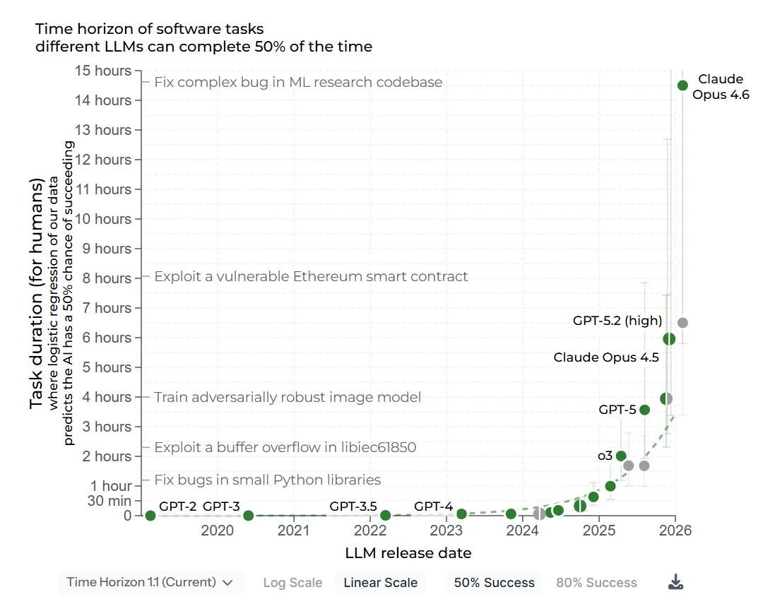 Wyniki są uderzające i dają wiele do myślenia. GPT-2 w 2019 roku radził sobie z zadaniami trwającymi około 30 sekund. GPT-3.5 kilkadziesiąt sekund, GPT-4 w 2023 roku kilka minut. Claude 3.7 Sonnet na początku 2025 już godzinę, a Claude Opus 4.6, wydany w lutym 2026, według METR ponad 14 godzin. W ciągu zaledwie czterech miesięcy (listopad 2025 - luty 2026) przeszliśmy z poziomu 6-7 godzin do 14,5 godziny, czyli prawie dwukrotnie.